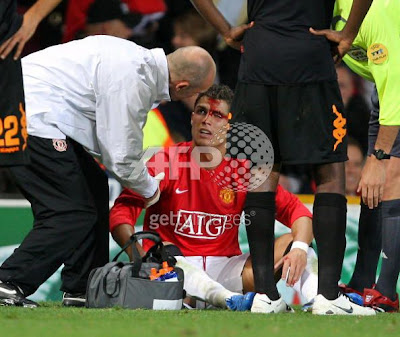O RonaldoNewsTeam, informa que Cristiano Ronaldo, após ter saido lesionado, a poucos minutos do fim do jogo de ontem,Manchester contra o Roma, levou quatro pontos na cabeça, mas não foi nada de grave, nada que cause maiores preocupações, e muito em breve já estará optimo. Mesmo assim o Ronaldo agradece a todos os fãs e visitantes do Blog a vossa preocupação.